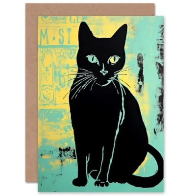 Artery8 Black Cat on Teal Blue for Him or Her Man Woman Birthday Thank You Congratulations Blank Art Greeting Card