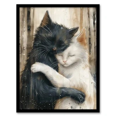 Artery8 Black Cat White Lover Hugging Watercolour For Living Room Artwork Framed Wall Art Print A4