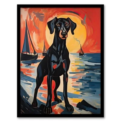 Artery8 Black Doberman Dog Artwork Coastal Sunset Seascape Acrylic Painting Orange Blue Sailboats Framed Wall Art Print A4