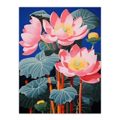 Artery8 Blooming Lotus Flowers Detailed Graphic Painting Pink Blue Green Stylised Aquatic Plant Extra Large XL Wall Art Poster Print