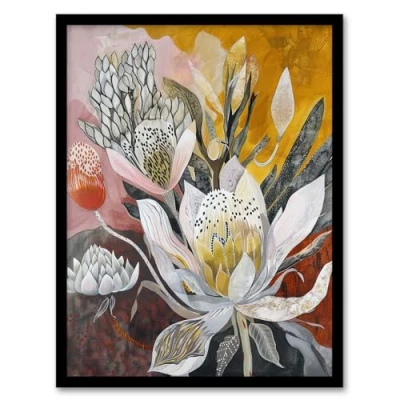 Artery8 Blooming Lotus Flowers Muted Tones Folk Art Living Room Artwork Framed Wall Print A4