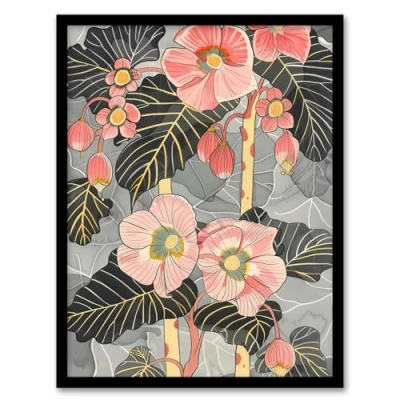 Artery8 Blooming Pink Begonia Flowers Stylised Floral Living Room Artwork Framed Wall Art Print A4