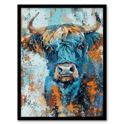Artery8 Blue Highland Cow Oil Painting Scottish Animal Living Room Artwork Framed Wall Art Print A4