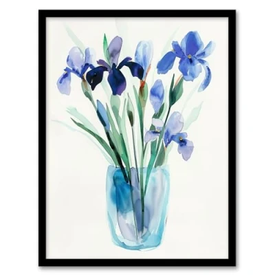 Artery8 Blue Iris Flower Bouquet Vase Floral Watercolour Living Room Artwork Framed Wall Art Print A4