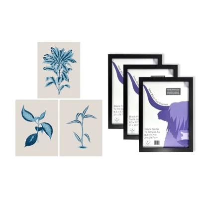 Framed Art Pack: This top-tier collection features 3 high quality, unframed wall art prints and 3 engineered wood frames. Each print is printed onto thick, luxurious art paper. Size: Each elegant piece is A4 sized and measures 29.7 x 21 cm (8.3 x 11.7 inches). Care & Quality: Please note that some assembly is required and that there may be some variation in the colour of the on-screen image and the actual item received. This is subject to the brightness and contrast of your screen settings. Versatility: These prints provide an aesthetic uplift to any space - be it living rooms, home offices, bedrooms, bathrooms, kitchens, and even B&Bs or traditional office environments. With our wide range of art styles from abstract to modern, classical, and more, there's something to cater to every art enthusiast's taste. Ideal Gift: Our art prints make a perfect, thoughtful gift for occasions like birthdays, Mothers Day, Christmas, Anniversary, or a housewarming present.
