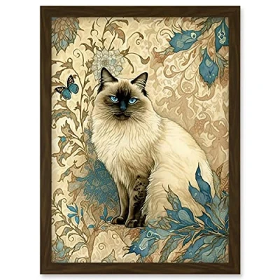Artery8 Blue Point Ragdoll Cat with Teal Plants Art Nouveau Watercolour Illustration Artwork Framed Wall Print A4
