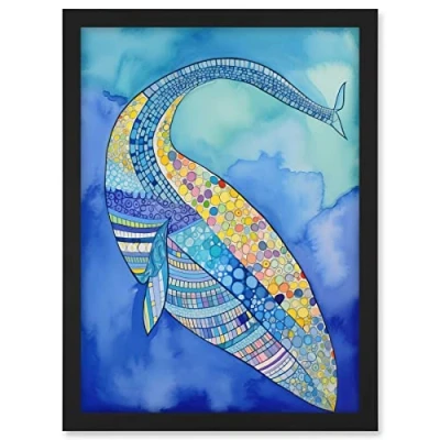 Artery8 Blue Whale With Multicolour Patterns Folk Art Watercolour Painting Artwork Framed A3 Wall Print