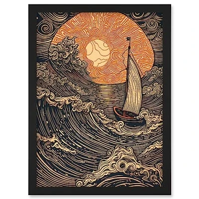 Artery8 Boat Sailing into the Sunset Linocut Illustration Artwork Framed Wall Art Print A4