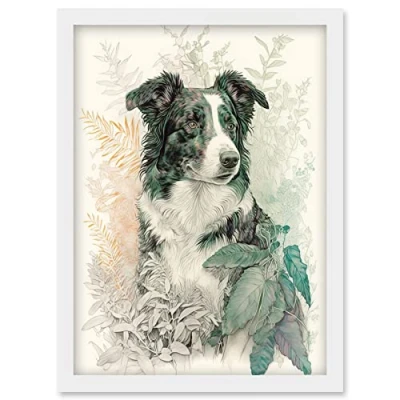 Artery8 Border Collie Dog in Field Modern Colour Pencil Portrait Illustration Artwork Framed Wall Art Print A4