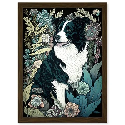 Artery8 Border Collie Dog in Wildflower Field Modern Illustration Artwork Framed Wall Art Print A4