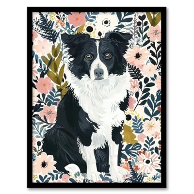 Artery8 Border Collie Dog Lover Pink Floral Portrait Living Room Artwork Framed Wall Art Print A4