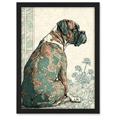 Artery8 Boxer Dog with Floral Pattern Fur Coat Modern Watercolour and Ink Illustration Artwork Framed A3 Wall Art Print