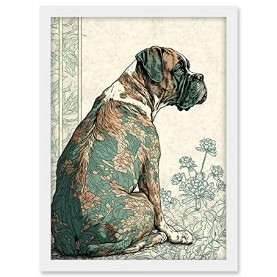 Artery8 Boxer Dog with Floral Pattern Fur Coat Modern Watercolour and Ink Illustration Artwork Framed A3 Wall Art Print