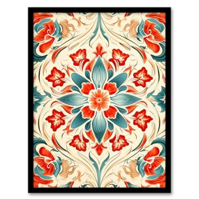 Artery8 Bright Arabesque Flower Design Red Blue Cream Ornate Symmetrical Floral Pattern Artwork Framed Wall Art Print A4