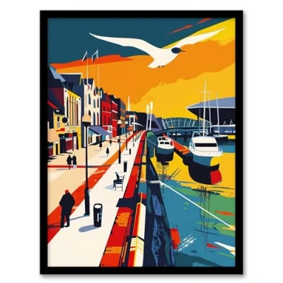 Artery8 Bright Colourful Cardiff Bay Artwork Bold Sunset Living Room Framed Wall Art Print A4