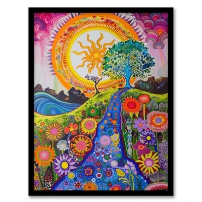 Artery8 Bright Colourful Hippy Artwork Flowers Sun Trees Living Room Framed Wall Art Print A4