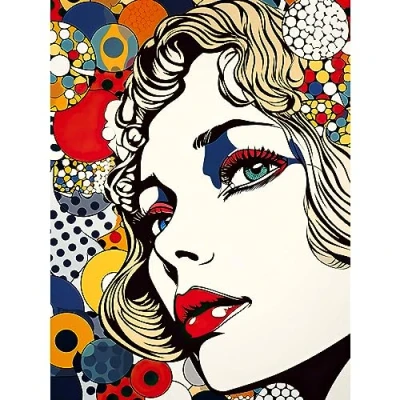Artery8 Bright Woman Face with Geometric Patterns and Bubbles Comic Book Style Pop Art Halftone Extra Large XL Wall Poster Print