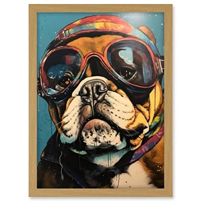 Artery8 Bulldog with Retro Motorcycle Goggles and Helmet Artwork Framed A3 Wall Art Print