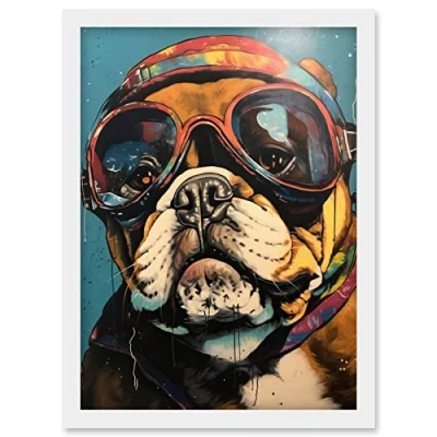 Artery8 Bulldog with Retro Motorcycle Goggles and Helmet Artwork Framed Wall Art Print A4