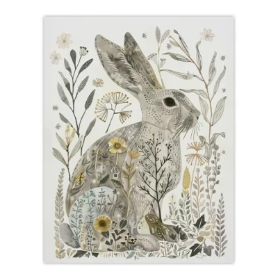 Artery8 Bunny Rabbit Flowers Grey Yellow Bright Folk Art Living Room Extra Large XL Wall Poster Print