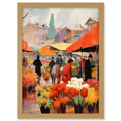 Artery8 Busy Flower Market Warm Amber Orange Yellow Oil Painting Artwork Framed A3 Wall Art Print