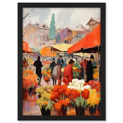 Artery8 Busy Flower Market Warm Amber Orange Yellow Oil Painting Artwork Framed A3 Wall Art Print