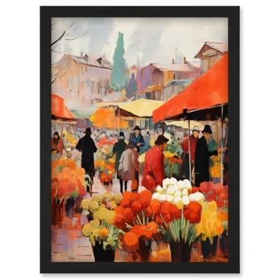 Artery8 Busy Flower Market Warm Amber Orange Yellow Oil Painting Artwork Framed Wall Art Print A4