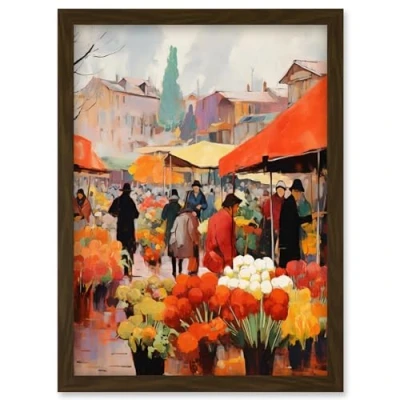 Artery8 Busy Flower Market Warm Amber Orange Yellow Oil Painting Artwork Framed Wall Art Print A4