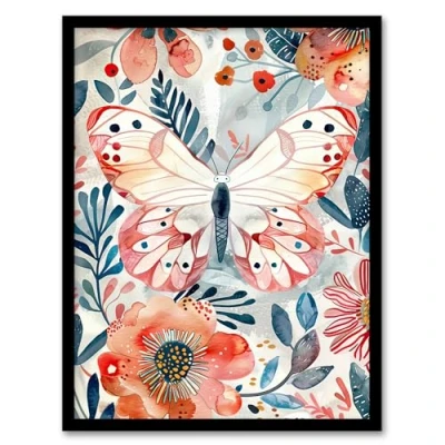 Artery8 Butterfly Red Blue Floral Watercolour Folk Art Kids Bedroom Nursery Artwork Framed Wall Print A4