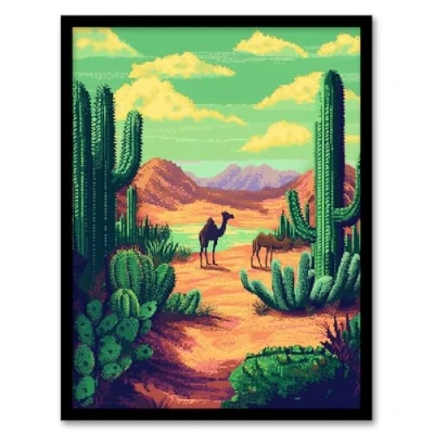 Artery8 Camels in Desert Cacti Oasis Pixel Art Landscape Living Room Artwork Framed Wall Print A4