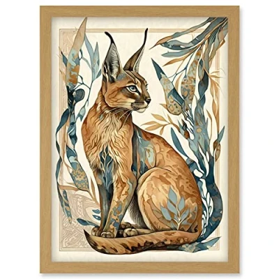 Artery8 Caracal Cat with Teal Plants Modern Art Nouveau Watercolour Illustration Artwork Framed Wall Print A4