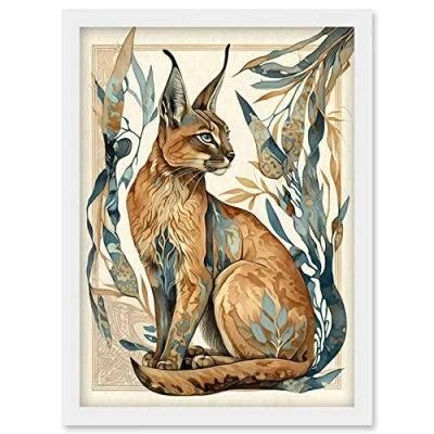 Artery8 Caracal Cat with Teal Plants Modern Art Nouveau Watercolour Illustration Artwork Framed Wall Print A4