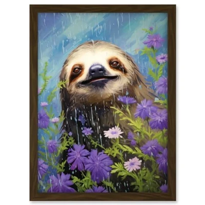Artery8 Carefree Sloth in a Field of Lavender Daisies Oil Painting Enjoying the Spring Rain Kids Bedroom Artwork Framed A3 Wall Art Print