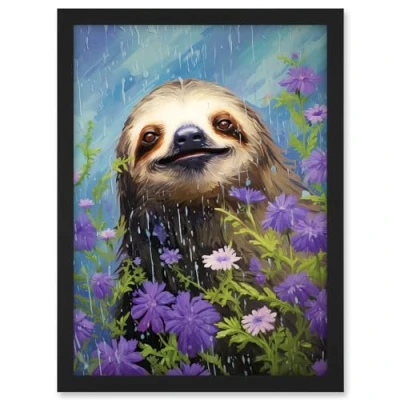 Artery8 Carefree Sloth in a Field of Lavender Daisies Oil Painting Enjoying the Spring Rain Kids Bedroom Artwork Framed A3 Wall Art Print