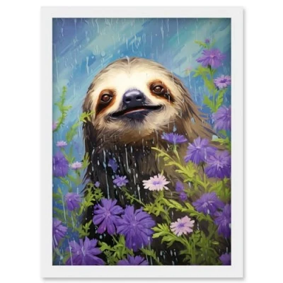 Artery8 Carefree Sloth in a Field of Lavender Daisies Oil Painting Enjoying the Spring Rain Kids Bedroom Artwork Framed Wall Art Print A4