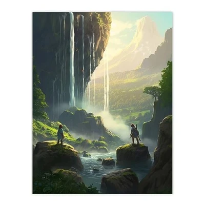 Artery8 Cascading Waterfall Painting Warriors on River Boulders in Enchanting Mountain Landscape Large Wall Art Poster Print Thick Paper 18X24 Inch