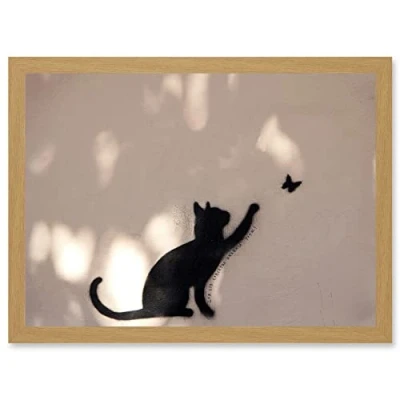 Artery8 Cat Butterfly Silhouette Graffiti Art Picture A4 Artwork Framed Wall Print