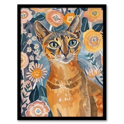Artery8 Cat Lover Abyssinian Floral Watercolour Folk Art Living Room Artwork Framed Wall Print A4