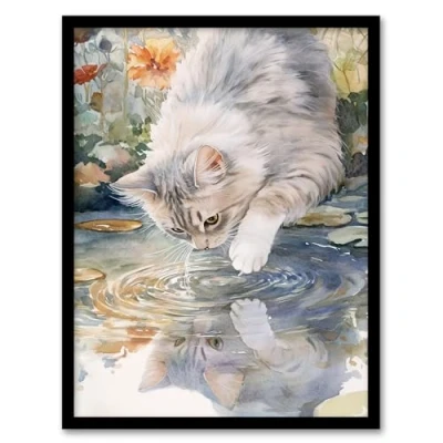 Artery8 Cat Lover Cute Kitten Pond Lake Watercolour Bathroom Toilet Artwork Framed Wall Art Print A4