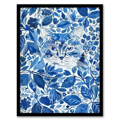 Artery8 Cat Lover Floral Blue China Pattern Watercolour Living Room Artwork Framed Wall Art Print A4