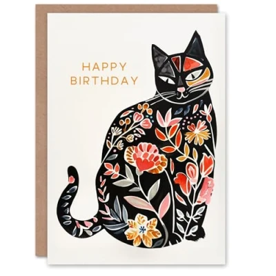 Artery8 Cat Lover Floral Pattern Pet Silhouette Folk Art For Her Woman Birthday Card