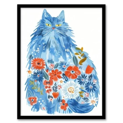 Artery8 Cat Lover Folk Art Blue Maine Coon with Flowers Living Room Artwork Framed Wall Print A4