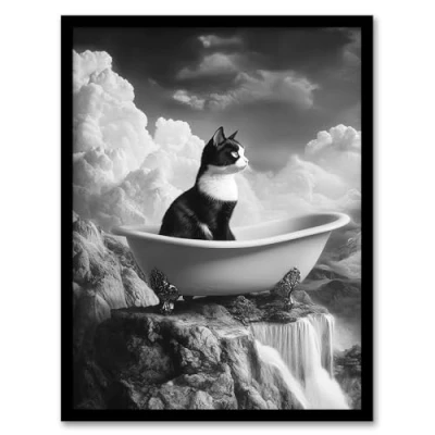 Artery8 Cat Lover Kitten Bathtub Waterfall Cliff Surreal Bathroom Toilet Artwork Framed Wall Art Print A4