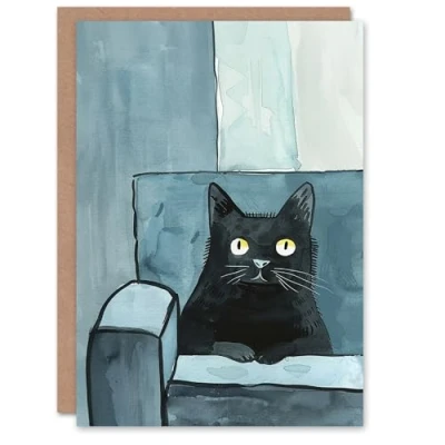 Artery8 Cat Lover Moggie Pet In Couch Fun Watercolour Blank For Him Or Her Art Birthday Card