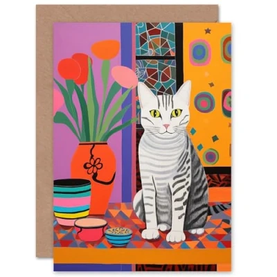 Artery8 Cat Lovers Folk Art Bright Fun for Wife Her Mum Sister Daughter Mom Gran Nan Birthday Thank You Congratulations Blank Greeting Card