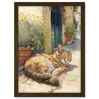 Artery8 Cat Sunbathing in Mediterranean Village Street Watercolour Illustration Artwork Framed A3 Wall Art Print