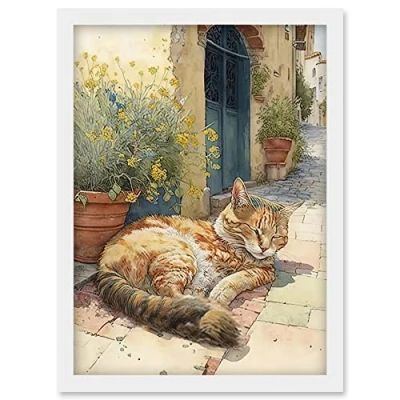 Artery8 Cat Sunbathing in Mediterranean Village Street Watercolour Illustration Artwork Framed Wall Art Print A4