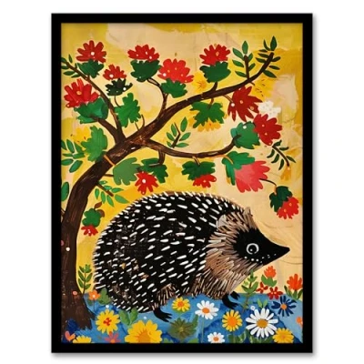 Artery8 Charming Hedgehog Under Tree Flowers Folk Art Kids Bedroom Artwork Framed Wall Print A4