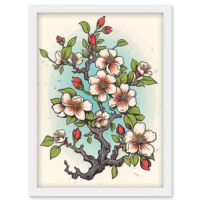 Artery8 Cherry Blossom Branch Bright Tattoo Ink Body Art Rockabilly Americana 50s Artwork Framed Wall Print A4