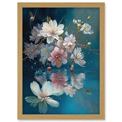 Artery8 Cherry Blossom Branch Dancing Over Water Modern Watercolour Painting Artwork Framed Wall Art Print A4